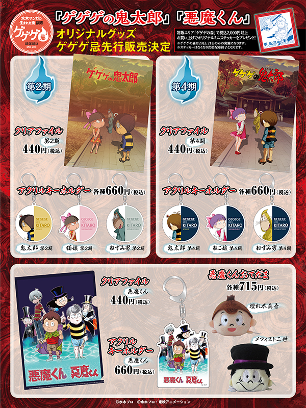 「ゲゲゲ忌2021」のメインビジュアルを使用した「悪魔くん」のグッズや悪魔くん(埋れ木真吾)、メフィスト二世のおてだまをはじめ、今年アニメ放送50周年の 「ゲゲゲの鬼太郎」第2期、アニメ放送25周年の「ゲゲゲの鬼太郎」第4期の新規描き起こしグッズも発売予定! そして「ゲゲゲ ゲゲゲの鬼太郎」プロジェクトのグッズの再販も決定!