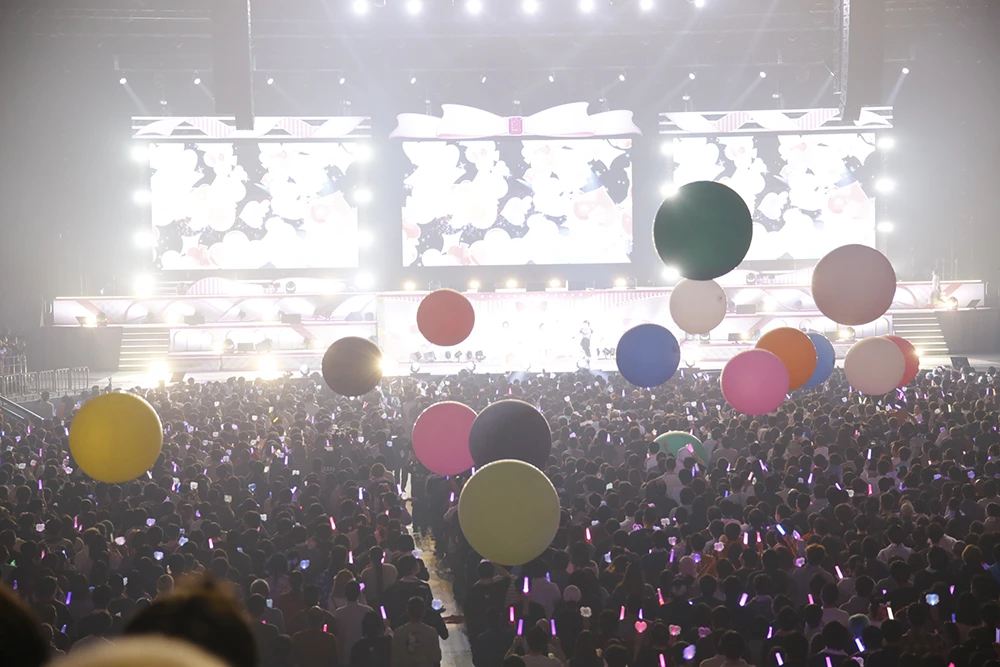 観客が持つミラクルペンライトが無線制御で一色に染まったり、アリーナ席の観客の頭上を大風船が弾んだり、曲ごとにさまざまな演出が行われていたのも印象的だ。