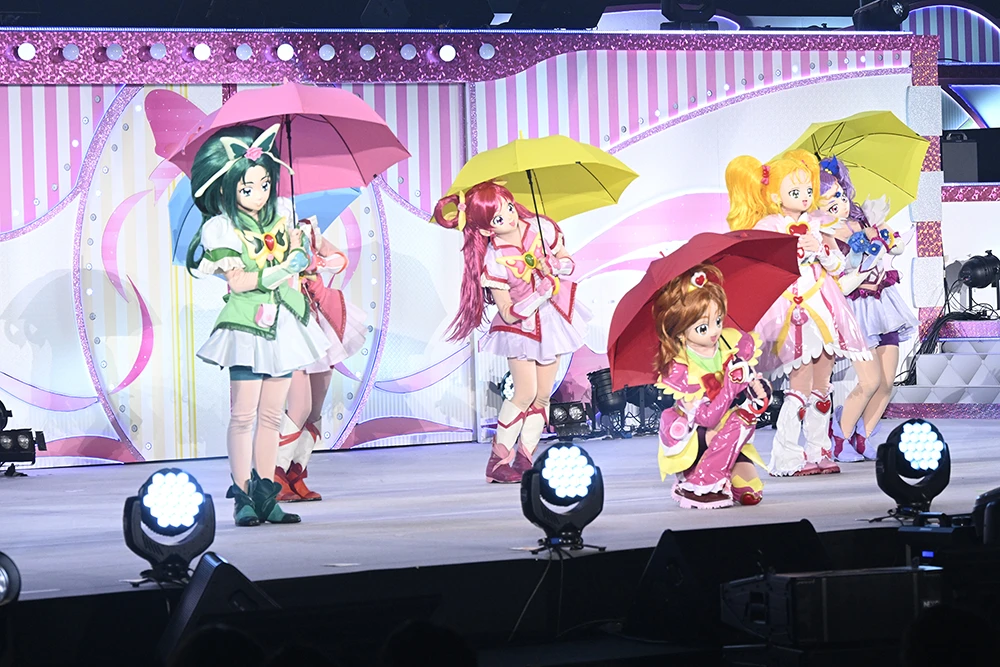 その後、続けて披露されたのは「スマイル」の「イェイ!イェイ!イェイ!」「満開*スマイル」、「ハートキャッチ」の「ハートキャッチ☆パラダイス!」「Tomorrow Song~あしたのうた~」、「ヒープリ」の「ミラクルっと♥Link Ring!」「エビバディ☆ヒーリングッデイ!」の6曲。シンガー、声優、プリキュアが一緒に彩るスペシャルなパフォーマンスに、会場は大興奮に包まれる。