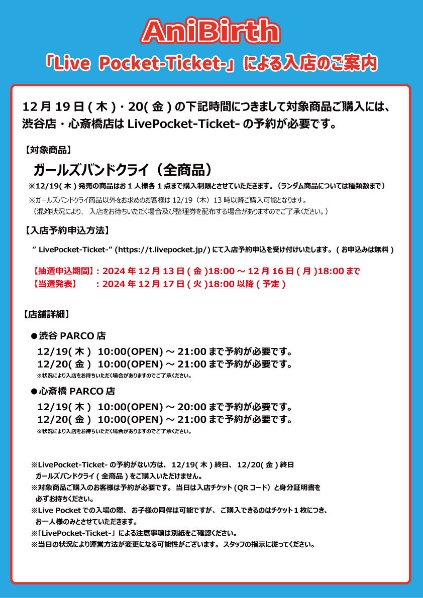 12/19(木)・12/20(金)AniBirth渋谷・心斎橋店「Live Pocket-Ticket-」による入店のご案内