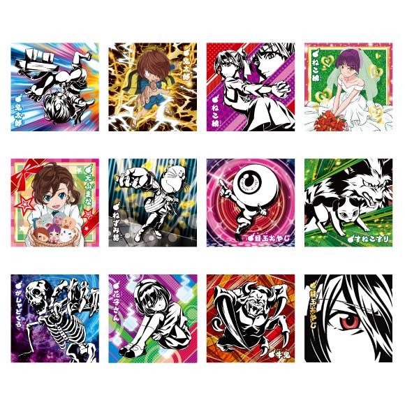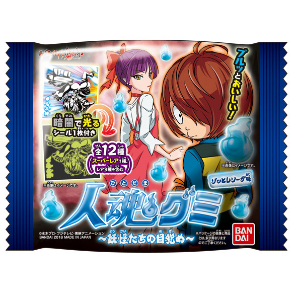 暗闇で光るシール刷新!【人魂グミ】の第2弾登場!グミ形状は妖怪の世界観にマッチした【人魂】型、中のグミは柔らかな食感を楽しめる【ゾっとしソーダ味】。暗闇で光る蓄光シールは“クール”でかっこいい鬼太郎達のモノトーンのタッチ、レアの【鬼太郎】、【犬山まな】そして【ねこ娘】はフルカラーデザイン。そして本弾からスーパーレアを新規に加えたノーマル