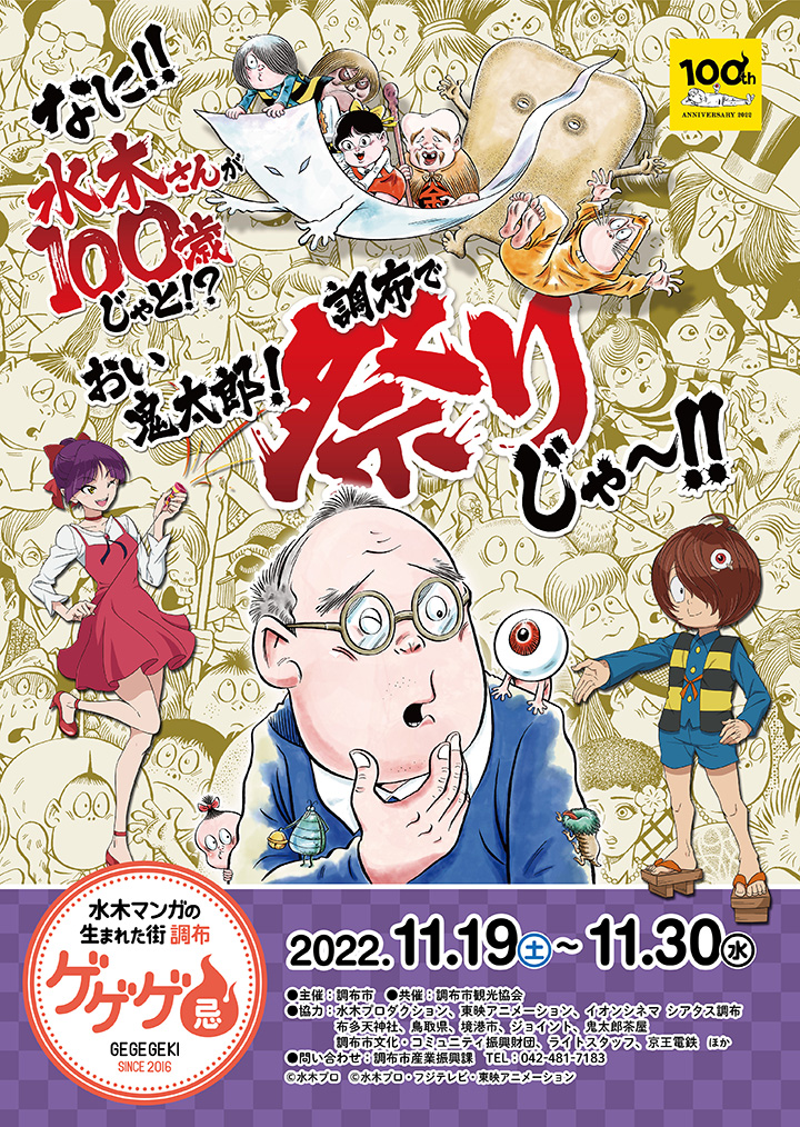 「ゲゲゲ忌2022」のメインビジュアルは、水木しげる生誕100周年記念イラストを使用し、 原作の鬼太郎と仲間たち、描きおろしのアニメ版鬼太郎とねこ娘が水木先生をお祝いしているデザインです。