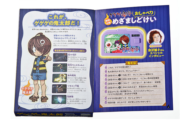 アニメ「ゲゲゲの鬼太郎」のスペシャルファンブック。特別豪華付録は「おしゃべり めざましどけい」。アニメーション本編の声優陣でこの商品のためだけに録りおろした限定商品です。設定時刻に鬼太郎、目玉おやじ、ねこ娘が日替わりで起こしてくれるめざましボイスアラーム機能のほか、「見えてる世界がすべてじゃない」などの名言・格言メッセージがランダムに再生される機能もついています。ファンブックには、目玉おやじの声優・野沢雅子さんの特別インタビューや鬼太郎関連の最新グッズまで大紹介。限定商品ですのでお見逃しなく!