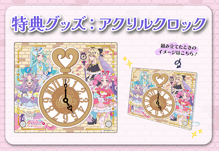 そのほかの特典は名探偵プリキュア!展内ショップで購入できるもの、または同展のノベルティとして配布されるものです。 - アクリルクロックは特典グッズ(アクリルクロック)付き入場チケットに付属する特典と同じデザイン・仕様です。