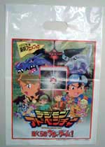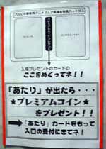 | 今回の入場者プレゼントは「デジモン」「ワンピース」の限定カードダス。前売り券の特典のカードダスと似ているが違うものである。何のカードかは是非手に入れてお確かめを。ちなみにカードダスにはくじがついており、「あたり」が出るとなんとプレミアムコインをプレゼント。「あたり」のでた人はかードを持って係員さんに渡せばOK。 | |||