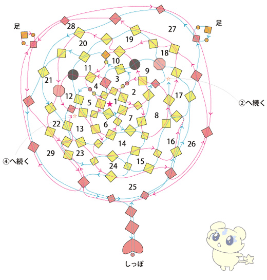 ★から作り始め、矢印に沿って番号順にテグスを通していきます。
