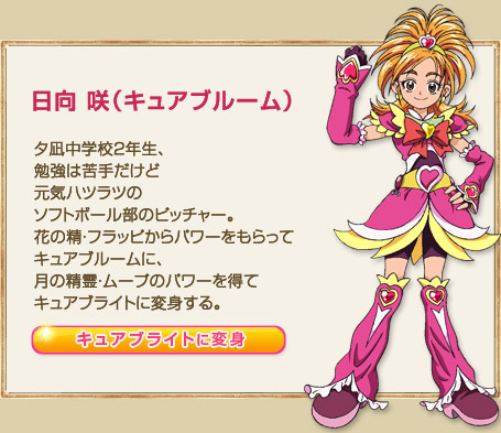 日向咲 キュアブルーム夕凪中学校2年生、勉強は苦手だけど元気ハツラツのソフトボール部のピッチャー。花の精・フラッピからパワーをもらってキュブルームに、、月の精霊・ムープのパワーを得てキュアブライトに変身する。