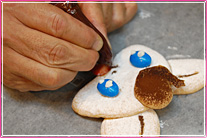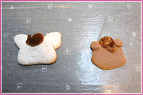 ココとナッツのかおのきじに、みみのきじをくっつけよう そのあとで、ココには、ちゃこしでデコレーションせんようのふんとうをふりかけて、ナッツにはふんとうとココアとおなじりょうをまぜたものをふりかけてね。 |