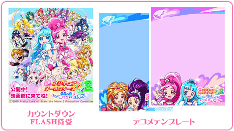 映画プリキュアオールスターズDX2 のケータイサイトでは《映画公開記念》として映画公開日までをカウントダウンで教えてくれるFLASH待受やデコメテンプレートをプレゼント中♪デコメでお友達を誘って映画館にいこう♪ さらに、【東映アニメフィルムブック】では、会員限定のデコメやスペシャル待受も配信中♪