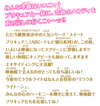 みんなの心のハーモニーを輝きに変えて、映画館でプリキュアたちを応援してね♪