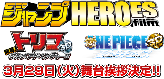 2011年3月19日に劇場公開が決まった『ジャンプ HEROES film トリコ 3D × ONE PIECE 3D』。集英社 週刊『少年ジャンプ』の不動のヒーロー『ONE PIECE』と、ニューヒーロー『トリコ』がスクリーンで大冒険を繰り広げます!