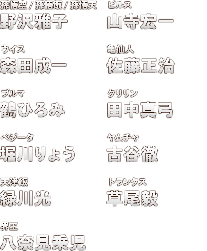 孫悟空/孫悟飯/孫悟天:野沢雅子 ビルス:山寺宏一 ウイス:森田成一 亀仙人:佐藤正治 ブルマ:鶴ひろみ クリリン:田中真弓 ベジータ:堀川りょう ピッコロ:古川登志夫 ヤムチャ:古谷徹 天津飯:緑川光 トランクス:草尾毅 界王:八奈見乗児