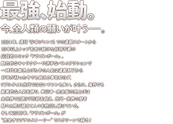 1984年、週刊「少年ジャンプ」での連載スタートから10年以上トップを走り続けた説明不要の伝説的コミック「ドラゴンボール」。魅力的なキャラクターや派手なバトルアクションで一時代を築き上げたその人気は連載終了から17年が経った今でも衰える事を知らず、リアルタイム世代ではないファンも多い。さらに、海外でも驚異的な人気を誇り、単行本・完全版の売上げは全世界で2億3千万部を超え、世代・世界の壁を軽々と飛び越えて人々を熱狂し続けている。そして2013年、「ドラゴンボール」が完全オリジナルストーリーでスクリーンで蘇る!