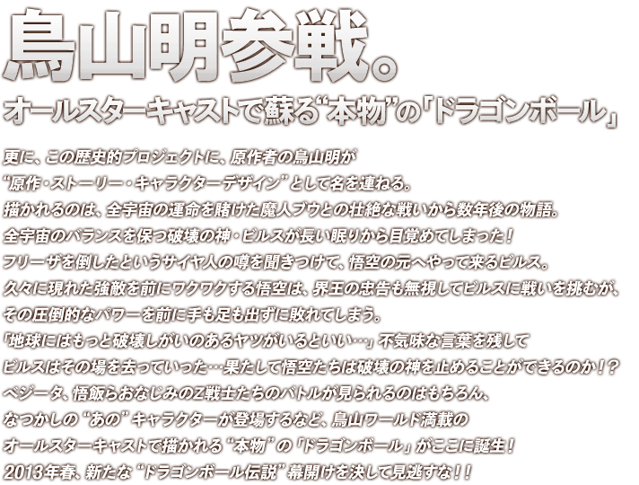 更に、この歴史的プロジェクトに、原作者の鳥山明が原作・ストーリー・キャラクターデザインとして名を連ねる。描かれるのは、全宇宙の運命を賭けた魔人ブウとの壮絶な戦いから数年後の物語。全宇宙のバランスを保つ破壊の神・ビルスが長い眠りから目覚めてしまった!フリーザを倒したというサイヤ人の噂を聞きつけて、悟空の元へやって来るビルス。久々に現れた強敵を前にワクワクする悟空は、界王の忠告も無視してビルスに戦いを挑むが、その圧倒的なパワーを前に手も足も出ずに敗れてしまう。「地球にはもっと破壊しがいのあるヤツがいるといい…」不気味な言葉を残してビルスはその場を去っていった…果たして悟空たちは破壊の神を止めることができるのか!?べジータ、悟飯らおなじみのZ戦士たちのバトルが見られるのはもちろん、なつかしのあのキャラクターが登場するなど、鳥山ワールド満載のオールスターキャストで描かれる本物の「ドラゴンボール」がここに誕生!2013年春、新たなドラゴンボール伝説幕開けを決して見逃すな!!