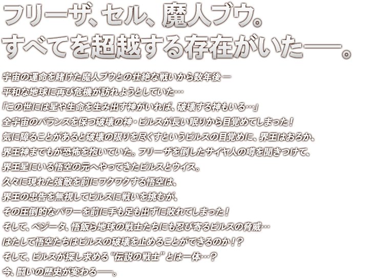 「この世には星や生命を生み出す神がいれば、破壊する神もいる…」全宇宙のバランスを保つ破壊の神・ビルスが長い眠りから目覚めてしまった!気に障ることがあると破壊の限りを尽くすというビルスの目覚めに、界王はおろか、界王神までもが恐怖を抱いていた。フリーザを倒したサイヤ人の噂を聞きつけて、界王星にいる悟空の元へやってきたビルスとウイス。久々に現れた強敵を前にワクワクする悟空は、界王の忠告を無視してビルスに戦いを挑むが、その圧倒的なパワーを前に手も足も出ずに敗れてしまった!