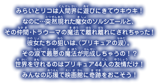 みらいとリコは人間界に遊びにきてウキウキ!なのに…突然現れた魔女のソルシエールと、その仲間・トラウーマの魔法で離れ離れにされちゃった!彼女たちの狙いは、〈プリキュアの涙〉。その涙で最悪の魔法が完成しちゃうの!?世界を守れるのはプリキュア44人の友情だけ!みんなの応援で映画館に奇跡をおこそう!