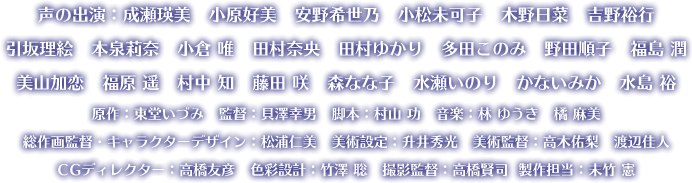 声の出演:成瀬瑛美、小原好美、安野希世乃、小松未可子、木野日菜、吉野裕行、引坂理絵、本泉莉奈、小倉 唯、田村奈央、田村ゆかり、多田このみ、野田順子、福島 潤、美山加恋、福原 遥、村中 知、藤田 咲、森なな子、水瀬いのり、かないみか、水島 裕/原作:東堂いづみ、監督:貝澤幸男/脚本:村山 功/音楽:林 ゆうき、橘 麻美/総作画監督・キャラクターデザイン:松浦仁美/美術設定:升井秀光/美術監督:高木佑梨、渡辺佳人/CGディレクター:高橋友彦/色彩設計:竹澤 聡/撮影監督:高橋賢司/製作担当:末竹 憲