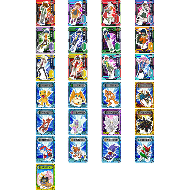 アグモン、ガブモン、パタモン、テイルモン、ピヨモン、テントモン、パルモン、ゴマモンの全8種!