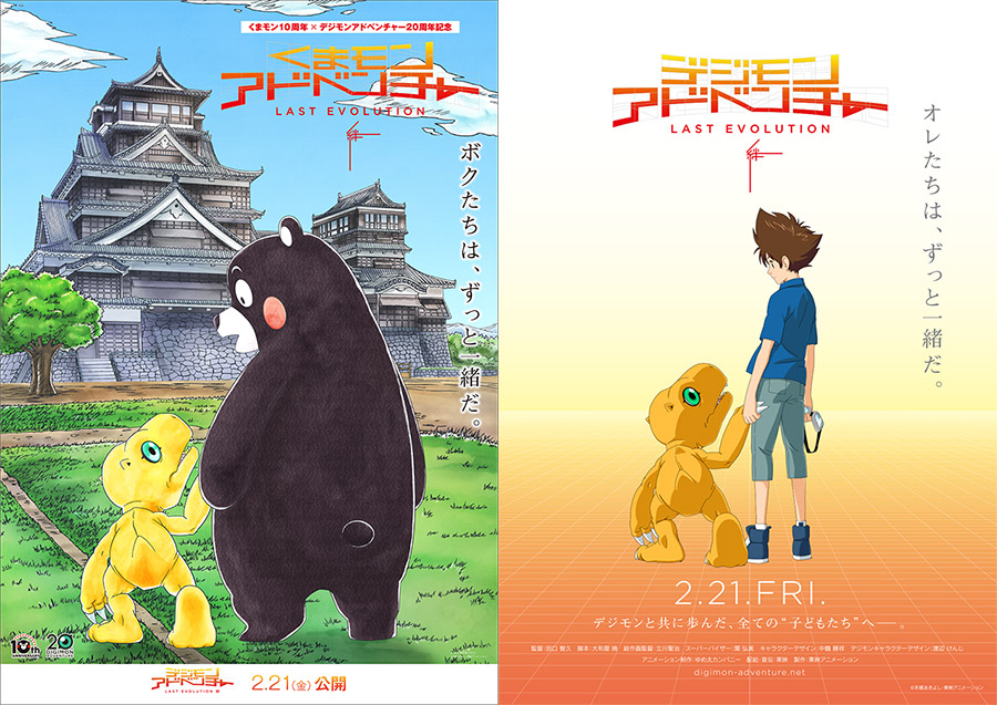 2010年のデビューから10周年を迎えるくまモンと、1999年の放送開始から20周年イヤーを迎えている「デジモンアドベンチャー」、双方の周年を記念して実現。 解禁されたコラボポスターは、『デジモンアドベンチャー LAST EVOLUTION 絆』のティザーポスターと同じ構図で、くまモンとアグモンが熊本城の前で手を繋いだ姿が描かれています。 このポスターは、くまモンビレッジ、くまモンスクエア、城彩苑、水の科学館、熊本城、熊本市博物館、熊本城ミュージアムわくわく座など熊本県内主要観光施設にて、約500枚が掲出される予定となっています。