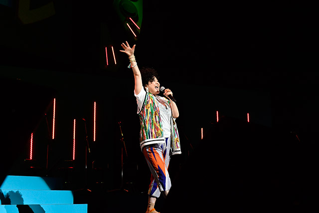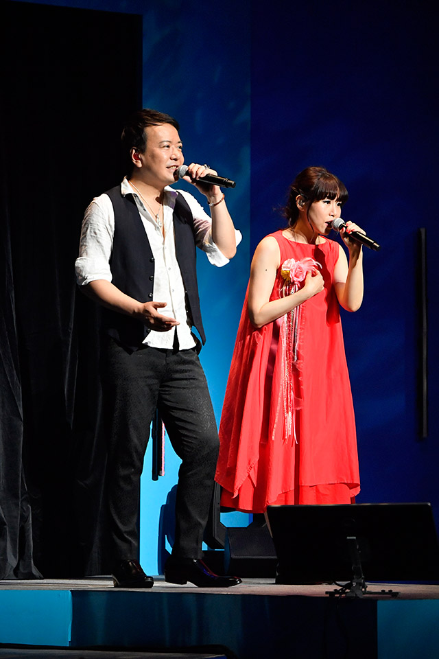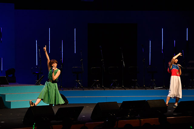 宮﨑 歩さんが「Beat Hit!」「Break up!」を、AiMさんが「I wish~tri.Version~」「keep on~tri. Version~」と、立て続けに馴染み深いナンバーを届けると会場のボルテージは最高潮に。 そして、第5章「共生」のエンディングテーマが、宮﨑 歩さんとAiMさんの初デュエット曲「アイコトバ」に決定したことが発表されると、会場は興奮の渦に包まれ、さらにここで初披露されました。