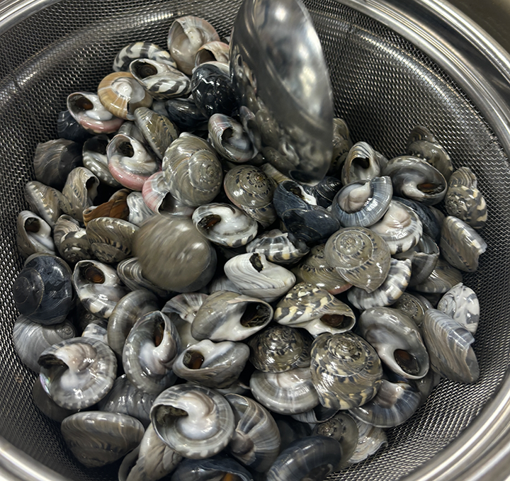 キラキラ光る真珠層を観察した後、ナガラミの試食が行われました。