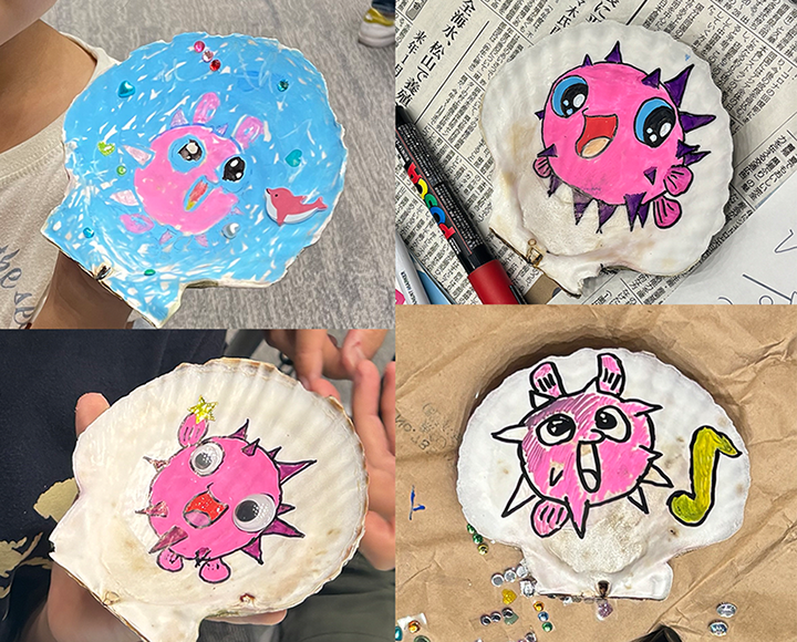 ホタテなどの貝殻にイラストを描くコーナーでは、