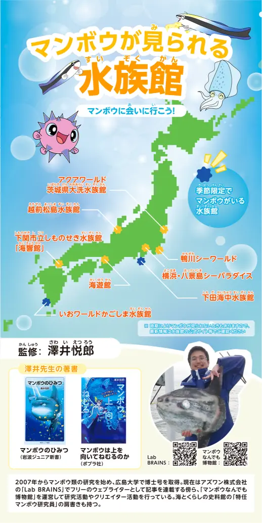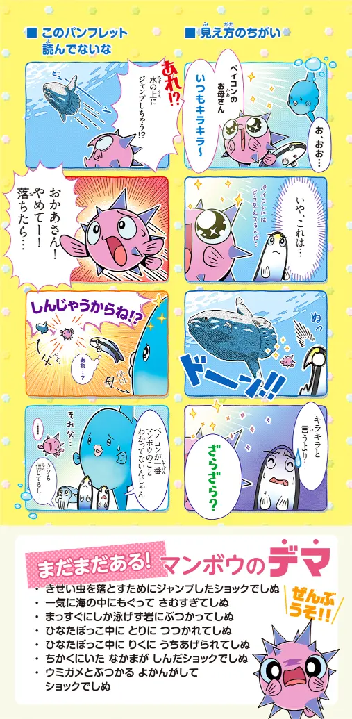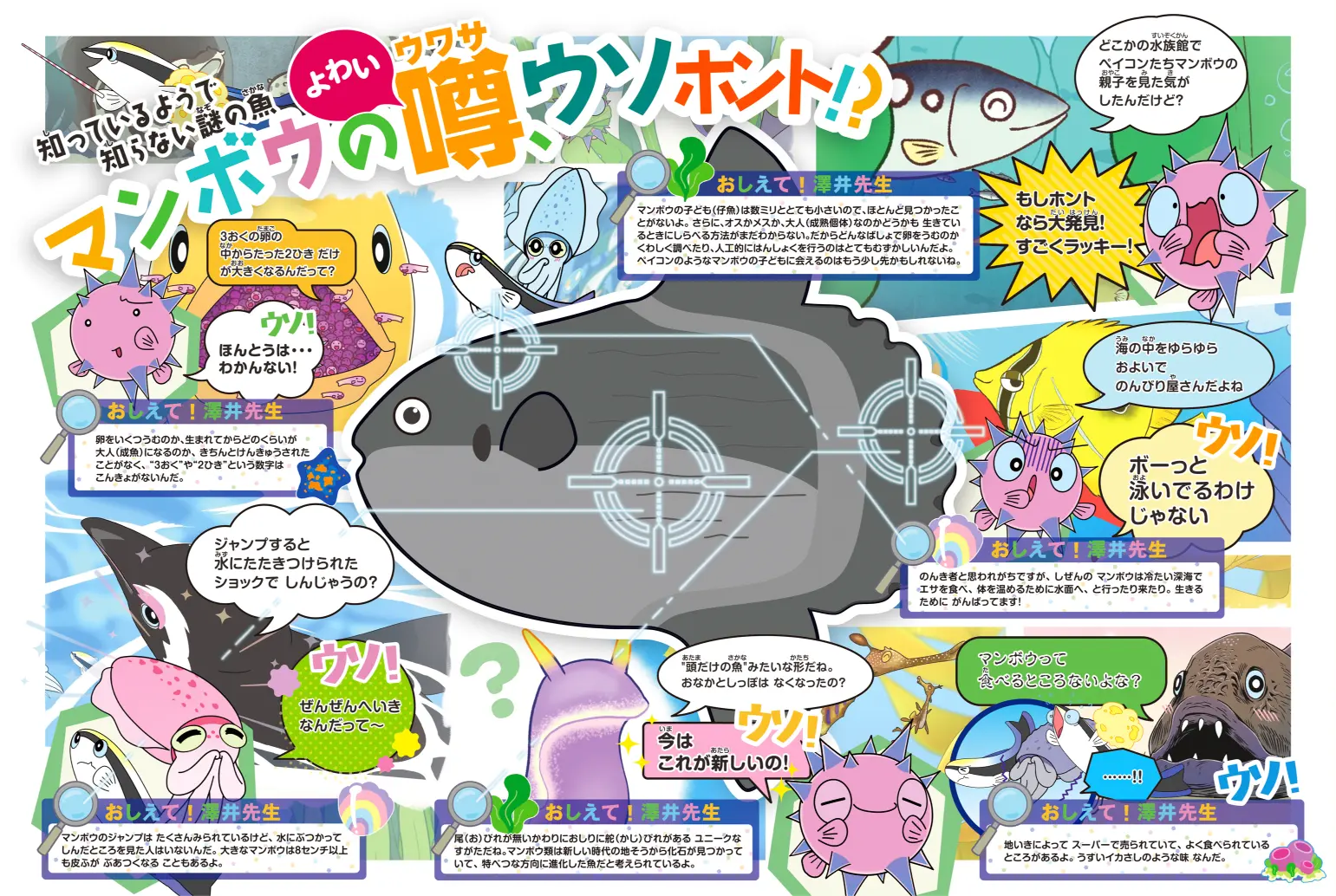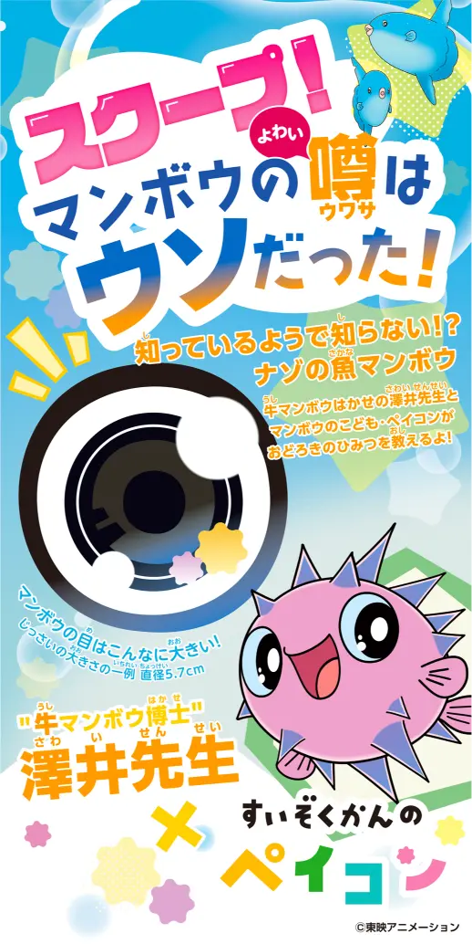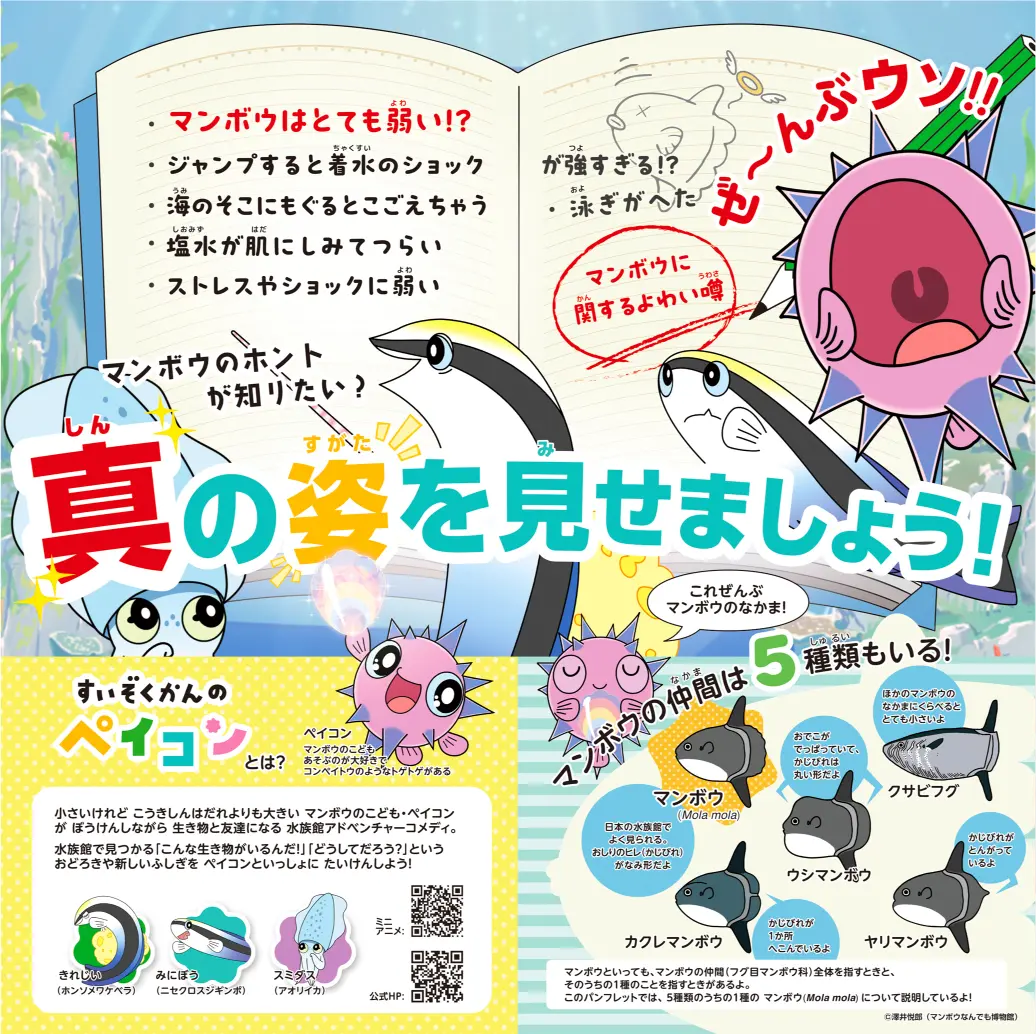 【ウシマンボウ博士xすいぞくかんのペイコン】コラボパンフレット完成! ニュース 2024.08.31 ウシマンボウ博士こと澤井悦郎さん監修のもと、 ペイコンたちとマンボウについて学べるパンフレットを作りました! マンボウのよくある誤解や素朴な疑問を楽しく解説しています。 全国のマンボウが見られる水族館も紹介! 本物のマンボウに会いに行ってみてくださいね。