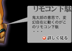 鬼太郎の意思で、変幻自在に動くのがこのリモコン下駄である。鬼太郎の足から放たれると、意思によって操作されて命中するまで相手を追いかける。その攻撃力は鬼太郎の持つものでも一,二を争う威力を誇こる。