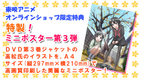 【 第3巻 】 11/22発売 ¥6,090(税込) ◆初回封入特典:メッセージCD、 設定資料集(キャラクターデザイン:高村和宏氏)、 かずといずみ描きおろしメッセージカード、 ジャケット裏ピンナップ仕様 ◆東映アニメオンラインショップ特典 特製ミニポスター(完全数量限定・A4サイズ) 第3巻先着特典決定! 「貧乏姉妹物語」DVD第3巻をお買い上げの方、 先着にて、キャラクターデザイン・高村和宏氏書き下ろし ジャケット柄DVD告知縦長ポスタープレゼント!! ※店舗によっては取扱のない場合がございます。 ![]() |