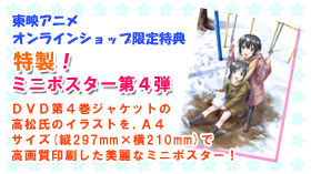 【 第4巻 】 12/20発売 ¥6,090(税込) ◆初回封入特典:メッセージCD、 かずといずみ描きおろしメッセージカード、 設定資料集(キャラクターデザイン:高村和宏氏) ジャケット裏ピンナップ仕様 ◆東映アニメオンラインショップ特典 特製ミニポスター(完全数量限定・A4サイズ) 第4巻先着特典決定! 「貧乏姉妹物語」DVD第4巻をお買い上げの方、 先着にて、キャラクターデザイン・高村和宏氏書き下ろし ジャケット柄DVD告知縦長ポスタープレゼント!! ※店舗によっては取扱のない場合がございます。