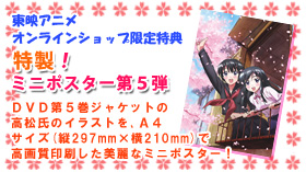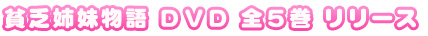 【 第5巻 】 1/24発売 ¥6,090(税込) ◆初回封入特典:メッセージCD、 かずといずみ描きおろしメッセージカード、 設定資料集(キャラクターデザイン:高村和宏氏) ジャケット裏ピンナップ仕様 ◆東映アニメオンラインショップ特典 特製ミニポスター(完全数量限定・A4サイズ) 第5巻先着特典決定! 「貧乏姉妹物語」DVD第5巻をお買い上げの方、 先着にて、キャラクターデザイン・高村和宏氏書き下ろし ジャケット柄DVD告知縦長ポスタープレゼント!! ※店舗によっては取扱のない場合がございます