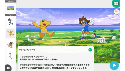 株式会社ディー・エヌ・エーが開発し無料で公開をしている、小学生向けプログラミング学習アプリ「プログラミングゼミ」内に、「デジモンアドベンチャー:」のキャラクターが登場します!主人公の八神太一や太一のパートナーデジモンであるアグモンなどのキャラクター18体が、本日から2021年1月31日までの期間限定で登場します。好きなキャラクターを選んで、プログラミングで自由にキャラクターを動かし、オリジナルの自分の作品を作りましょう。