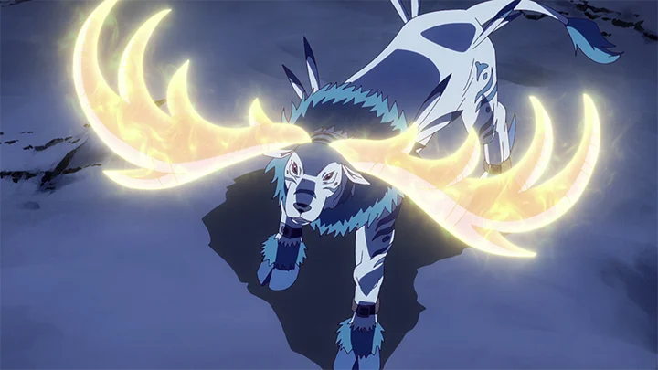 アーマー体の古代獣型デジモン。必殺技の『ホーンブレード』は巨大な角で空間そのものを切り裂く技で、相手が離れていようとも空間ごと切断することが可能である。