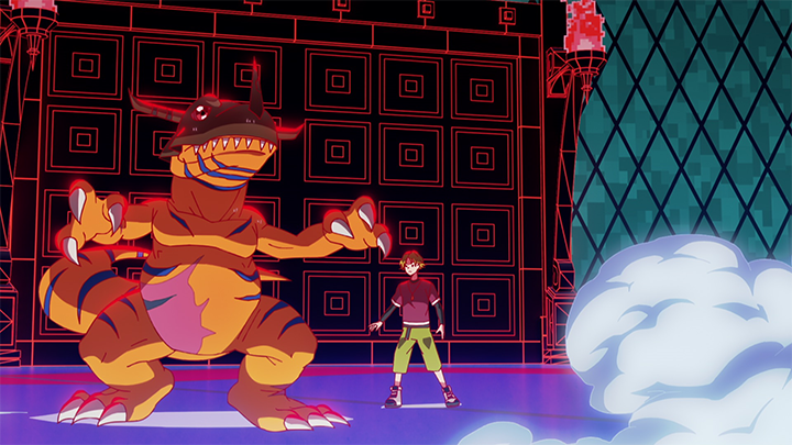 頭部の皮膚が硬化して甲虫のような殻に覆われた恐竜型デジモン。鋭い爪、巨大な角を持った全身凶器のような体を持つ。必殺技の『メガフレイム』は口から超高熱火炎を吐き出し全てを焼き払う。