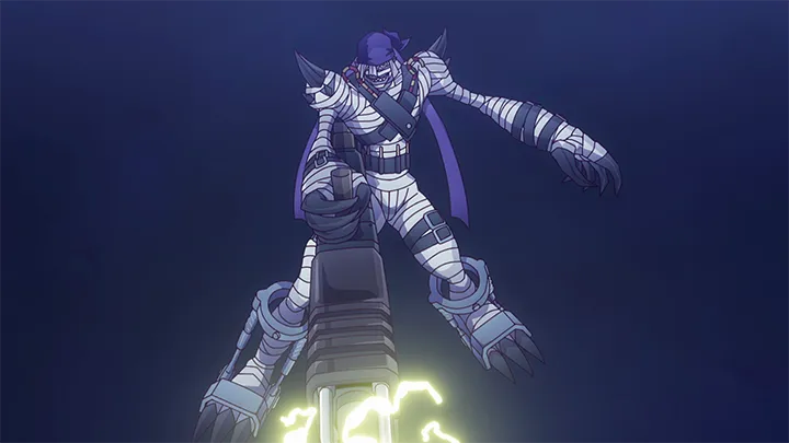 エジプトのミイラの様な全身包帯巻きのアンデッド型デジモン。愛用の銃「オベリスク」を乱射する。得意技は両腕の包帯が蛇のように伸びて敵を締め付ける『スネークバンデージ』。