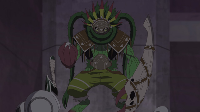 民族のように群れで棲息する植物型デジモン。必殺技は大木をも一瞬で切り倒す万能鉈で敵を討つ『アサルトハチェット』と、後頭部から生えた触手で敵を縛り付ける『タイドアップアイビー』。