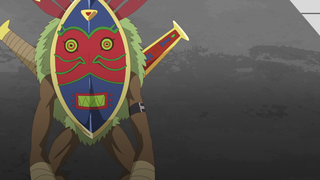 魔人型デジモン。その異様な仮面の力により、死者の魂と会話を可能にしている。通常はデジタルワールドの密林の奥深くに潜み、めったに人前にでてくる事はない。必殺技は死者の魂を封じ込めた呪いの武器『スピリットブーメラン』。変幻自在の軌道で敵を翻弄する。