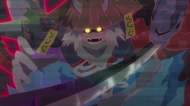 アンデッド型デジモンで、格上相手にも決して退かずに手段を選ばず戦う狂戦士。必殺技は刀からの斬撃『千万ノ太刀(ちよろずのたち)』、下半身の鬼火を分離させて広範囲を炎で灼く『羅焼門(らしょうもん)』。