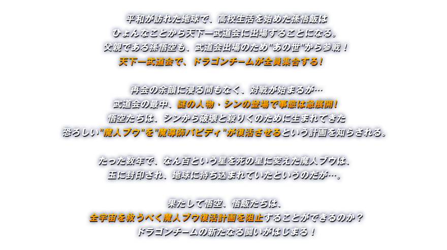 平和が訪れた地球で、高校生活を始めた孫悟飯はひょんなことから天下一武道会に出場することになる。父親である孫悟空も、武道会出場のため"あの世"から参戦!天下一武道会で、ドラゴンチームが全員集合する! 再開の余韻に浸るあいだもなく。大戦が始まるが…武道外の最中、謎の人物・シンの登場で事態は急展開!ごくうたちは、シンから破壊と殺りくの為に生れて来た恐ろしい"魔人ブウ"を"魔導士バビディ"が復活させるという計画を知らされる。たった数年で、なん百という星をしの星に変えた魔人ブウは、球に封印され、地球に持ち込まれていたというのだが… 果たして悟空、ご飯たちは、全宇宙を救うべく魔人ブウ復活計画を阻止する事が出来るのか?ドラゴンチームの新たなる闘いがはじまる!