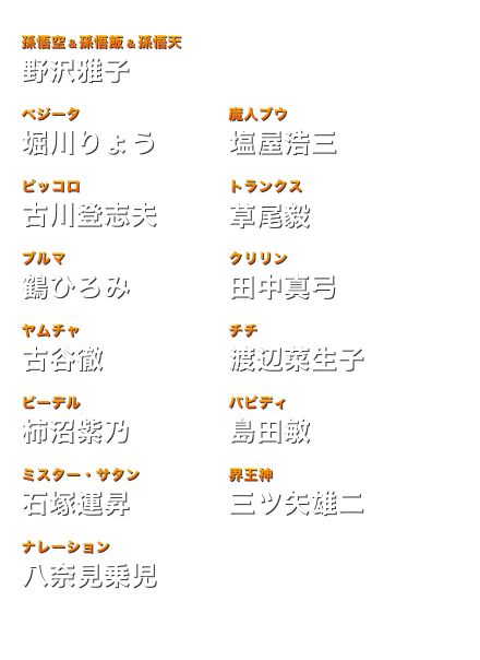 孫悟空&孫悟飯&孫悟天/野沢雅子 ベジータ/堀川りょう 魔人ブウ/塩屋浩三 ピッコロ/古川登志夫 トランクス/草尾毅 ブルマ/鶴ひろみ クリリン/田中真弓 ヤムチャ/古谷徹 チチ/渡辺菜生子 ビーデル/柿沼紫乃 バビディ/島田敏 ミスター・サタン/石塚運昇 界王神/三ツ矢雄二 ナレーション/八奈見乗児