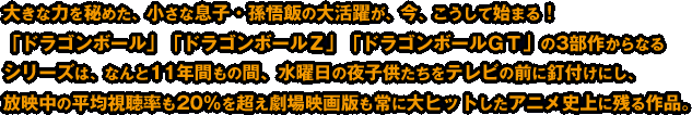 ナメック星での激しい闘いから1年。 平和が訪れた地球に突如、自らを改造しパワー・アップを果たしたメカ・フリーザが降り立った!!その横には、さらに強力な気を持つ父・コルド大王の姿も。 悟空が帰ってくる気配もない中、これで地球も終わりかと思われたその時…フリーザたちの前に謎の少年が現れる。そして超サイヤ人に変身すると、背中の剣でフリーザを一刀両断!!あの宇宙の帝王、フリーザ親子をあっさりと倒してしまう!! 謎の少年の名はトランクス。なんと、20年後の未来から悟空たちに警告を与えるために訪れた、ベジータとブルマの間に生まれた子供だったのだ!! トランクスは告げる。「3年後、2人組の恐ろしい敵が街に現れる」と−−。 果たして、ドクター・ゲロが生み出した史上最悪の人造人間たちとは?彼らの目的は? そして、その背後に潜むさらなる恐怖とは?! 過去と未来を股にかけて、悟空たちの新たなる闘いが今再び、ここに幕を開ける!! |