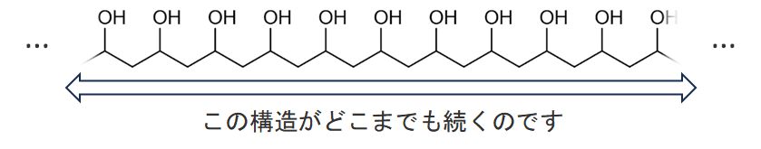- PVA(ポリビニルアルコール)とは、ビニルアルコール(C2H4O)が非常に沢山つながった(ような)構造を持つ分子です。