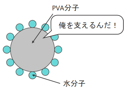 - PVAは水と馴染みやすい分子です。なので、ちょっとやそっとでは水分子を離してくれません。