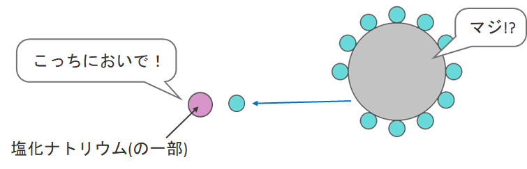 - ですが、食塩(塩化ナトリウム)を入れるとどうでしょう。食塩も水に溶けるとき、自分の周りに水分子を連れてきます。食塩のほうがPVAより水分子を引っ張る力が強いので、PVA分子の周りの水分子を引き剥がします。