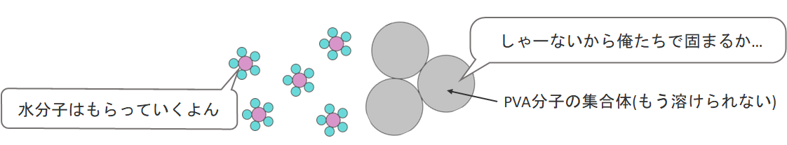 - 溶けていられなくなったPVA分子はお互いに集まり、沈殿として現れます。これが塩析です。