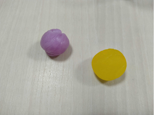 ④できたもの。紫は成形に失敗しました。少し跳ねなくなります。