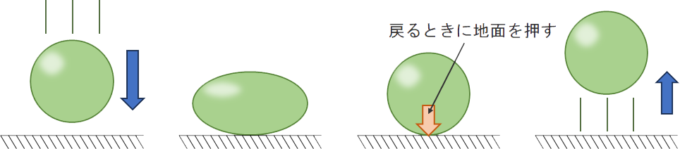 - この性質によって、潰れたボールは元の形に戻ろうとします。この時に地面を下向きに押すので、ボールは跳ねるのです。