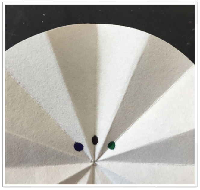 - 写真のように、ろ紙に水性インキで点を描いて、ペットボトルキャップに入れた水の中に、端を浸してみましょう。