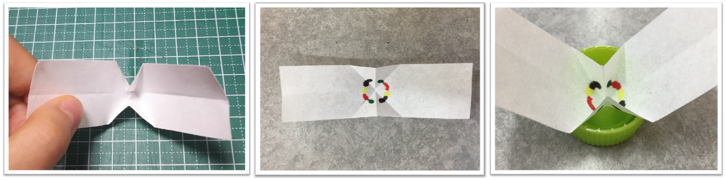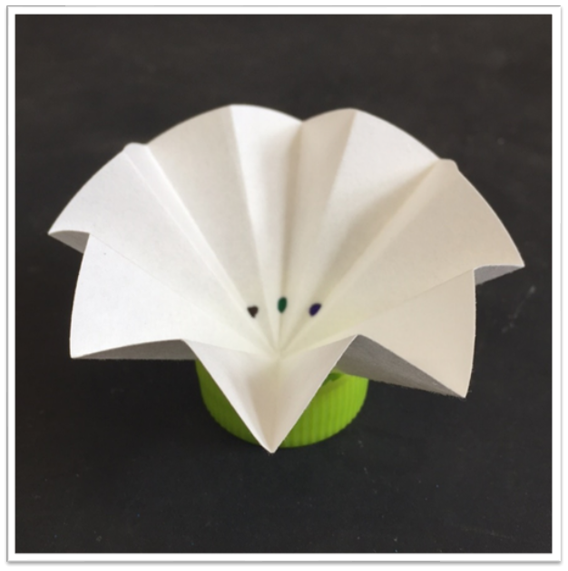 - 作り方はとても簡単で、四角く切ったろ紙にひだをつけ、水性ペンで点を描いた後に水に浸けるだけです。