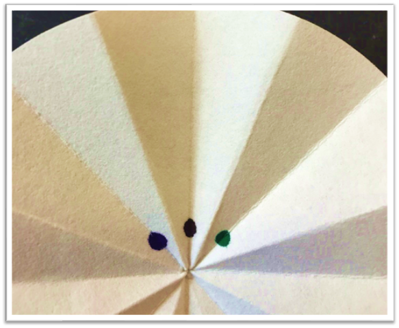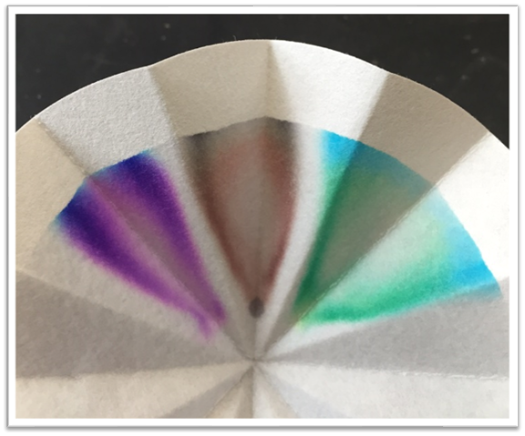 - 水性インキは水に溶けやすいので、染み込んでいく水に乗ってろ紙に広がっていきます。